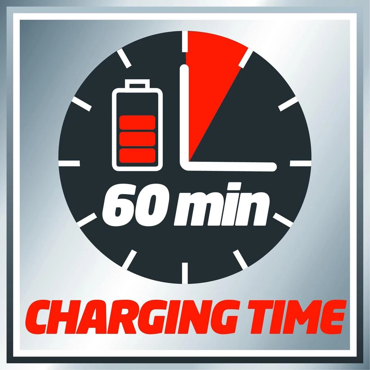 Deze accu kettingzaag werkt op een krachtige 18 V oplaadbare accu uit de Power-X-Change productlijn. Deze accu heeft drie handige LED’s, die je een indicatie van de vulstand van de accu geven. De accu 1x 3,0 Ah word meegeleverd. Heb je al gereedschap van de Power-X-Change-productlijn, dan kun je dezelfde accu’s en lader gebruiken voor deze Kettingzaag. Door de technische mogelijkheden van nu met lithium-ion accu’s heeft ook Einhell een complete productlijn ontwikkelt waarbij de accu’s onderling uitwisselbaar zijn. Binnen deze Power-X-Change productlijn kunt u dus één en dezelfde accu in verschillende machines gebruiken. Bijvoorbeeld met de accu van de schroefmachine even snel de graskantjes trimmen, zelfs het opladen van USB producten, alles is mogelijk. U kunt vrijwel alle artikelen uit de Power-X-Change productlijn ook als “SOLO” versie (zonder accu & lader) aanschaffen. Als u reeds een Power-X-Change accu heeft zorgt dit er dus voor dat u veel geld kunt besparen. Doordat Einhell zelf een intelligent accu systeem heeft ontwikkeld, kunt u ook met toekomstige Einhell machines uw bestaande accu’s blijven gebruiken. Dit scheelt u geld in uw portemonnee. Het opladen van de accu voor deze accu kettingzaag verloopt snel, met de Einhell Power-X-Change 18 V snellader. De snellader wordt 1x meegeleverd.