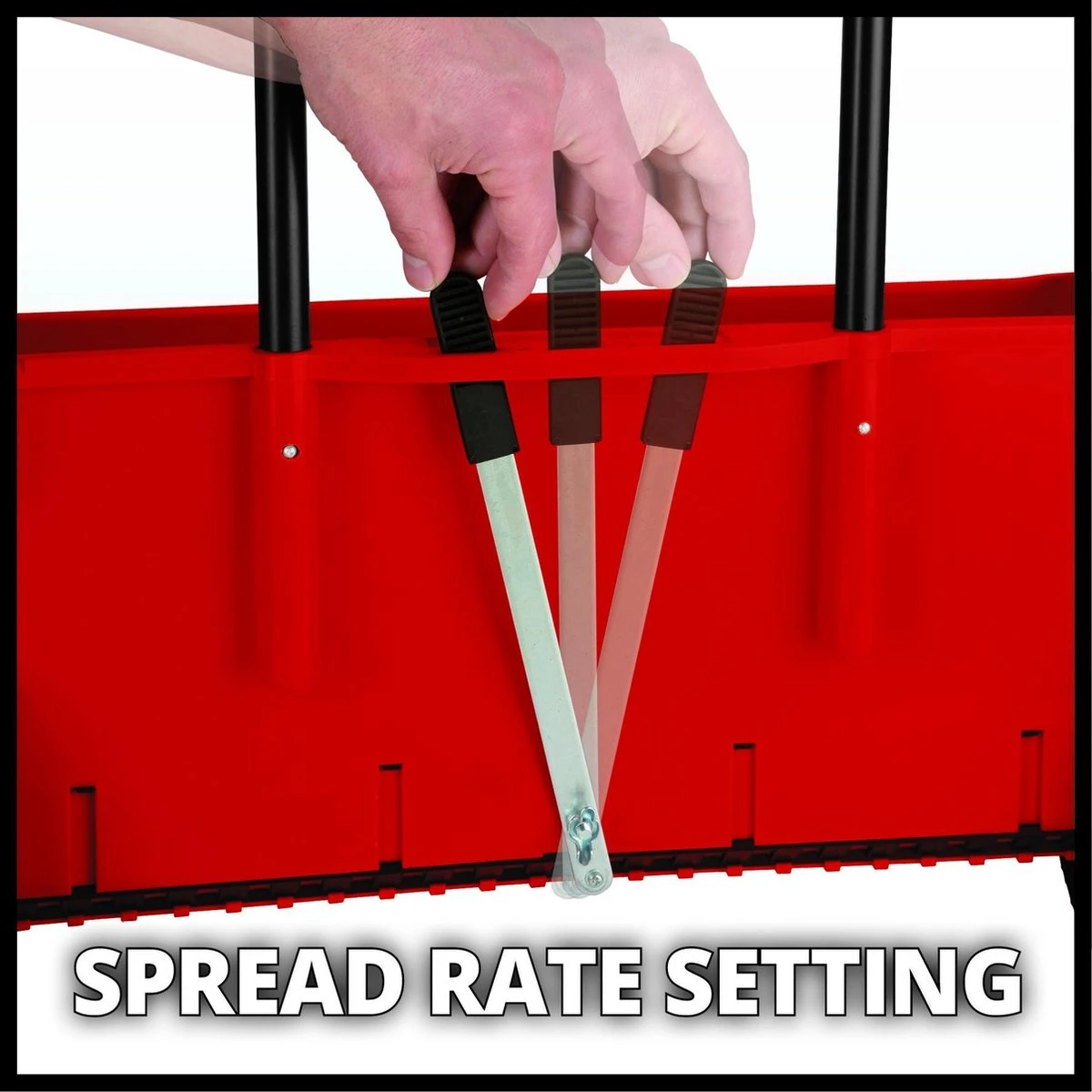 De behuizing van de strooiwagen is gemaakt van hoogwaardig, slagvast kunststof, terwijl de rol bestand is tegen zowel corrosie als weersinvloeden. Er is een instellingshendel voor het regelen van de distributiesnelheid. Veervergrendelingen aan beide zijden maken opslag in een minimale ruimte mogelijk. Het max. gebruiksoppervlak is 400 m2