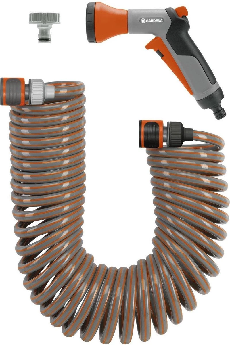 Gardena spiraalslang-set Ideaal voor het watergeven aan planten op balkon en terras of voor de besproeiing van bijv. de voortuin. Maakt lastig op- en afrollen van de tuinslang of slepen met gieters overbodig. Na gebruik veert de slang door de trekkracht van de spiraal automatisch weer terug. Inhoud: 10 m spiraalslang compleet met slangstuk en waterstop, pistoolbroes 8120, kraanstuk 900, 901 en 902.