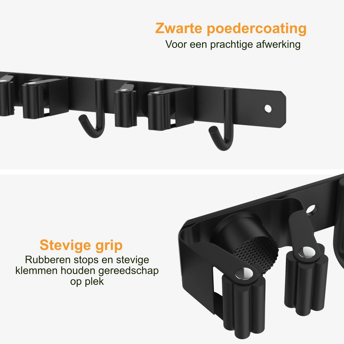 Deze bezemhouder wordt gecoat met een dubbele zwarte poedercoating. Het resultaat is een prachtig mat zwarte bezemhouder die perfect past in ieder modern interieur.